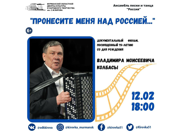 Документальный фильм о мурманском композиторе и музыканте Владимире Колбаса покажет ДК имени С. М. Кирова. Премьера состоится в онлайн-формате 12 февраля.