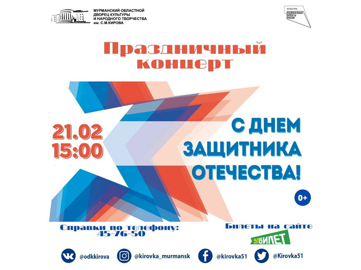 В Мурманском областном Дворце культуры и народного творчества им. С. М. Кирова 21 февраля в 15.00 состоится праздничный концерт, посвященный Дню Защитника Отечества.