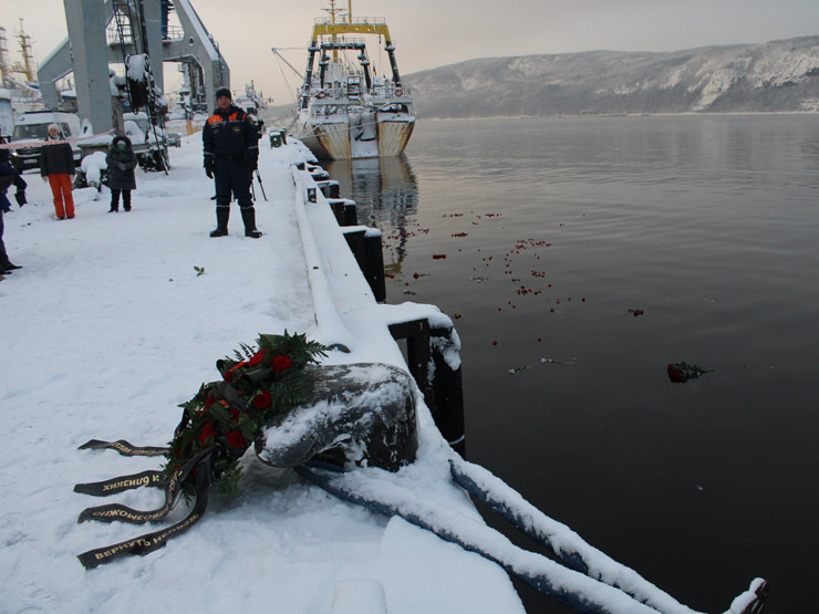 Участие в церемонии приняли родные погибших моряков и спасатели Мурманской области. Они возложили венок к кнехту, а красные гвоздики положили на воды залива.