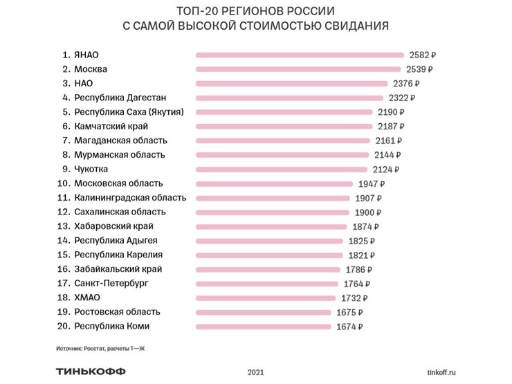 В среднем по стране одно свидание обходится в 1671 рубль. При этом самое дорогое свидание произойдёт в Ямало-Ненецком АО. На втором месте оказалась Москва с 2539 рублями, следом идут Ненецкий АО (2376 рублей), Дагестан (2322 рубля), Якутия (2190 рублей), Камчатский Край (2187 рублей), Магаданская область (2161 рубль).