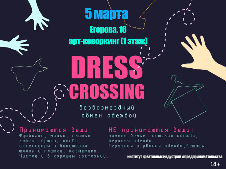 Принести можно любую одежду - футболки, кофты, платья, брюки, аксессуары, украшения и косметику. Не принимается на дресс-кроссинге верхняя и ветхая одежда, обувь и нижнее белье. Отмечается, что вся одежда должна быть в хорошем состоянии.