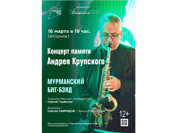 Областная филармония приглашает 16 марта на концерт Мурманского биг-бэнда под управлением выпускника мурманского колледжа искусств, а ныне художественного руководителя и главного дирижёра «Концертного оркестра Югры» г. Ханты-Мансийск Сергея Свиридова. Концерт посвящен памяти преподавателя Мурманского колледжа искусств, талантливого музыканта, саксофониста Андрея Петровича Крупского.