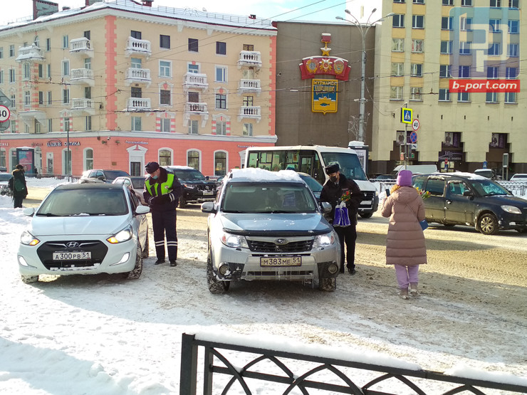 В преддверии Международного женского дня на дорогах Мурманска поздравили женщин-водителей. Сотрудники Госавтоинспекции останавливали автомобили и вручали дамам тюльпаны и подарки.
