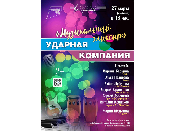 Ансамбль «Ударная Компания» Мурманской областной филармонии с огромной радостью представляет новую программу «Музыкальный эликсир», наполненную всеми любимыми красивыми, поднимающими настроение мелодиями. Прозвучат композиции из мюзиклов «Вестсайдская история», «Моя прекрасная леди», «Звуки музыки», «Шербурские зонтики», «Мэрри Поппинс, до свидания», песни из кинофильмов «Моя любовь, «Карнавальная ночь», мелодии Гершвин, Мэндэла…