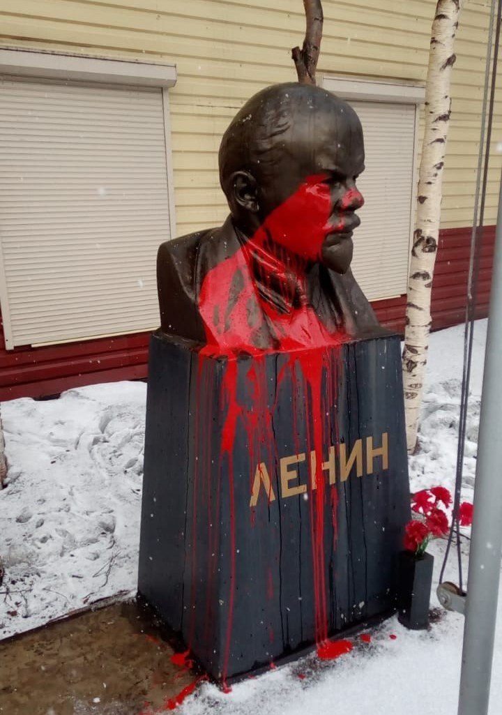 В Мурманске возле Мурманского обкома КПРФ на улице Комсомольской неизвестные облили красной краской бюст Владимиру Ленину. Инцидент произошёл в ночь с 9 на 10 апреля.