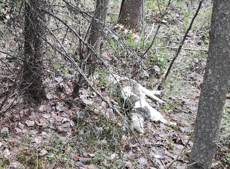 Жители Кандалакши, гуляя с собаками, 23 апреля обнаружили в лесном массиве тело убитой собаки. Рядом на траве лежал намордник, а на дереве висел окровавленный поводок. Фотографии увиденного северяне опубликовали в соцсетях.