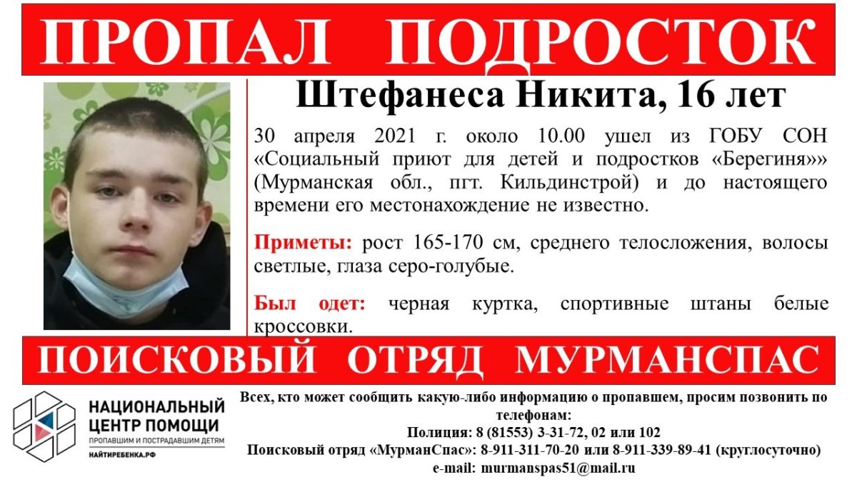 Еще 30 апреля 16-летний Никита Штефанеса ушел в десять утра из социального приюта для детей и подростков «Берегиня» в Кильдинстрое. Прошла уже неделя, но до сих пор о его местонахождении ничего не известно. Подросток был одет в черную куртку, спортивные штаны и белые кроссовки. Он среднего телосложения, рост 165-170 см, волосы светлые, глаза серо-голубые.