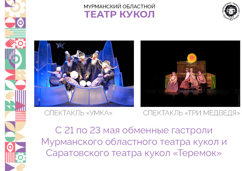 В свою очередь артисты Мурманского областного театра кукол с 21 по 23 мая покажут в Саратове спектакли «Умка» и «Три медведя».