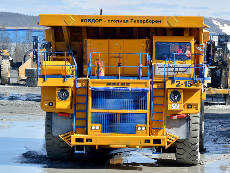 Новые карьерные самосвалы появились на комбинате благодаря успешному сотрудничеству Ковдорского ГОКа с фирмой «БелАЗ». Два предприятия связывают долгие годы продуктивной работы, реализовано огромное количество совместных проектов. Благодаря уникальности ковдорского карьера и суровому заполярному климату, рудник «Железный» часто выступает в качестве испытательного полигона для белорусских машин. Многие ноу-хау БелАЗа проходят обкатку именно на Ковдорском ГОКе.