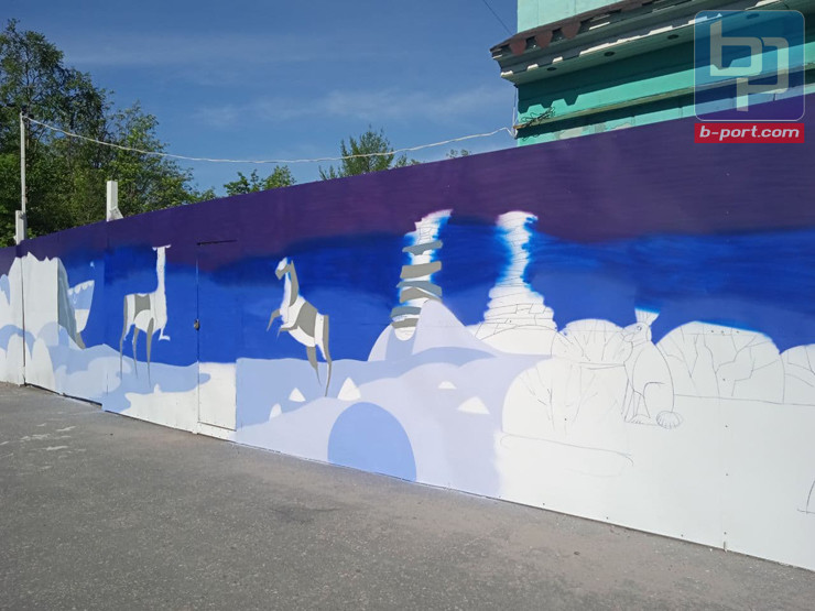 В Мурманске на заборе вокруг кинотеатра «Родина» появляются первые рисунки. Преображением ограждения занимается мурманская художница и её команда.