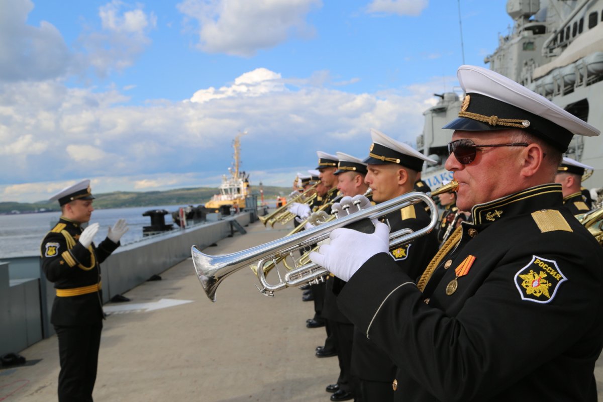 На причале в Североморске учебный корабль встретили офицеры соединений надводных кораблей и родители нахимовцев под звуки военного оркестра Северного флота.
