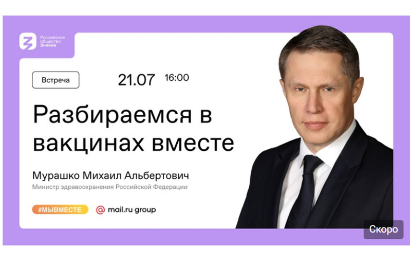 В среду, 21 июля, в 16 часов в рамках проекта «Разберёмся в вакцинах вместе» состоится прямой эфир с министром здравоохранения РФ Михаилом Мурашко. Трансляцию проведёт Российское общество «Знание» на своём сайте и в социальной сети «ВКонтакте».