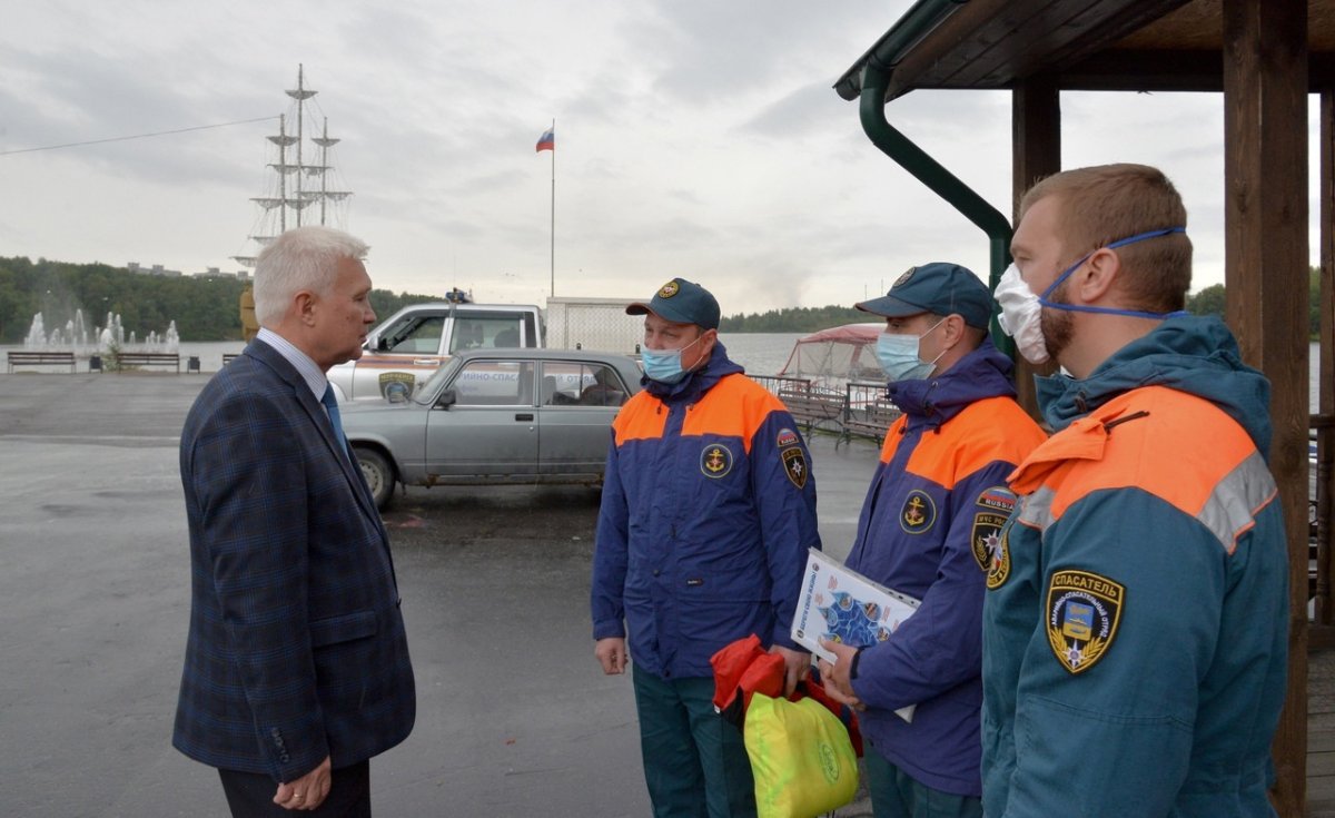 Сотрудники аварийно-спасательного отряда патрулируют озеро на лодке