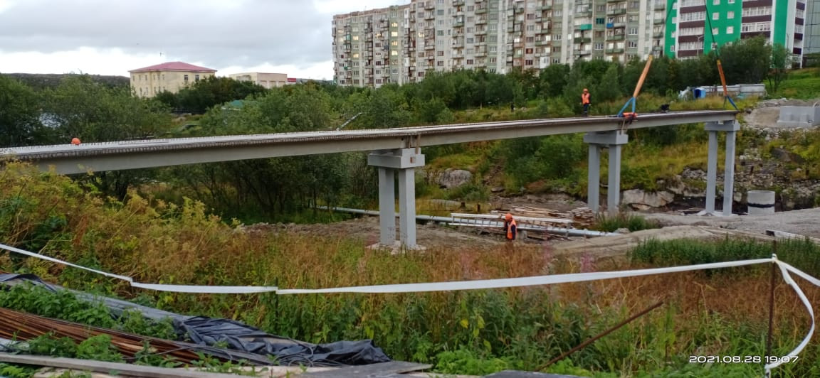 В Полярном планируют завершить строительство пешеходного моста между улицами Моисеева и Душенова в течение двух месяцев. Об этом сообщили в министерстве строительства Мурманской области.