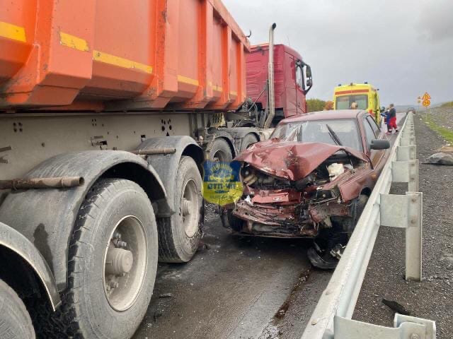 В четверг, 2 сентября, на 1525 км трассы “Кола” под Заполярным произошло ДТП. Легковой автомобиль ВАЗ врезался в грузовик “Volvo” и оказался зажат у барьерного ограждения.