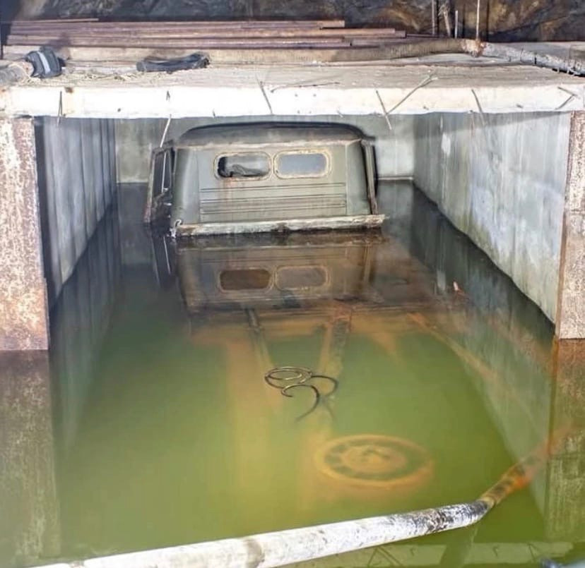 По наводке местных жителей блогеры направились в заброшенное бомбоубежище возле МАГУ. Внутри они обнаружили военный автомобиль, фотография которого стала вирусной в социальных сетях. Бункер наполовину затоплен и недоступен к эксплуатации.