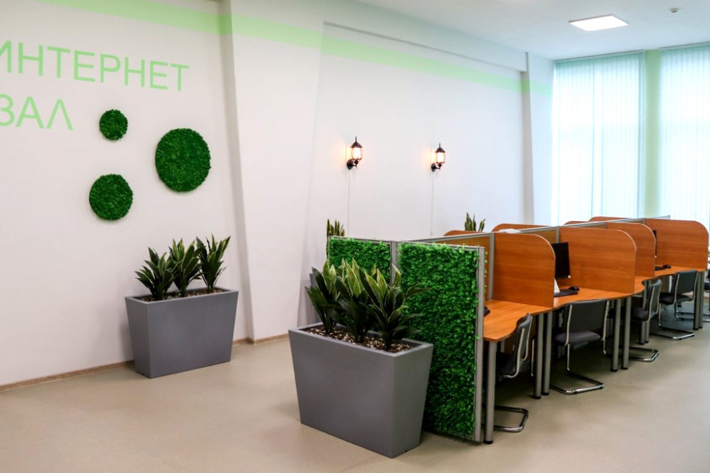 Интернет-зал Мурманской областной универсальной научной библиотеки оформили в экостиле. Интерьер пополнился элементами из искусственных растений и натурального мха. Отделенные деревянными перегородками компьютерные столы и зелень создают иллюзию близости к природе.