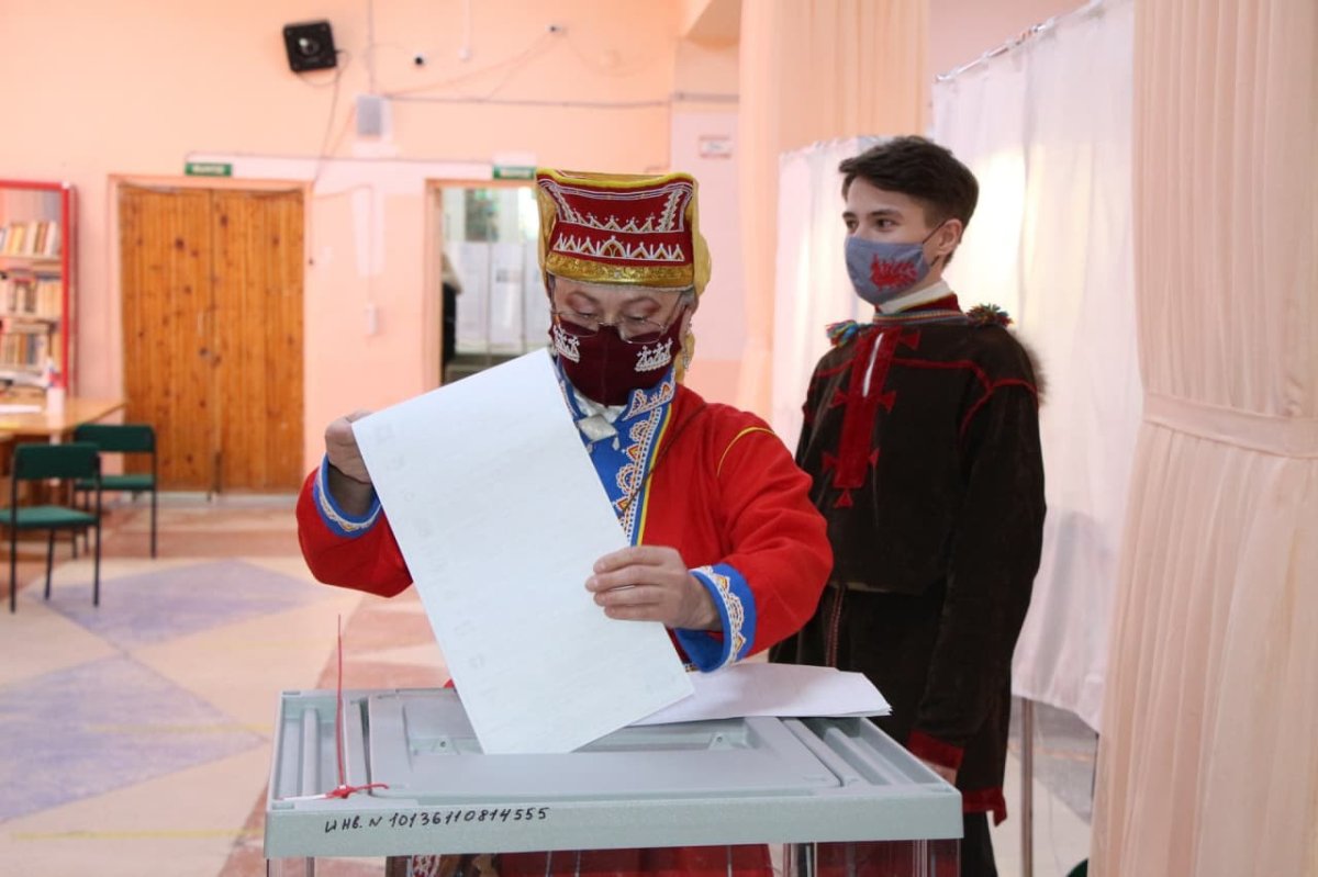 Представители малочисленного коренного народа Мурманской области пришли на выборы депутатов федерального и регионального парламентов в саамских народных костюмах.