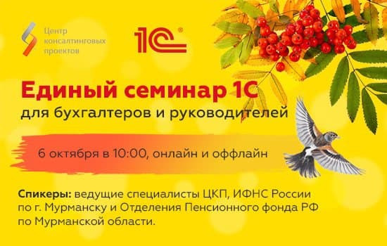 Центр консалтинговых проектов приглашает бухгалтеров, работников кадровых служб, финансовых директоров и руководителей организаций города Мурманска на бесплатный Единый семинар 1С "Изменения в учете и отчетности. Новые возможности программ 1С".