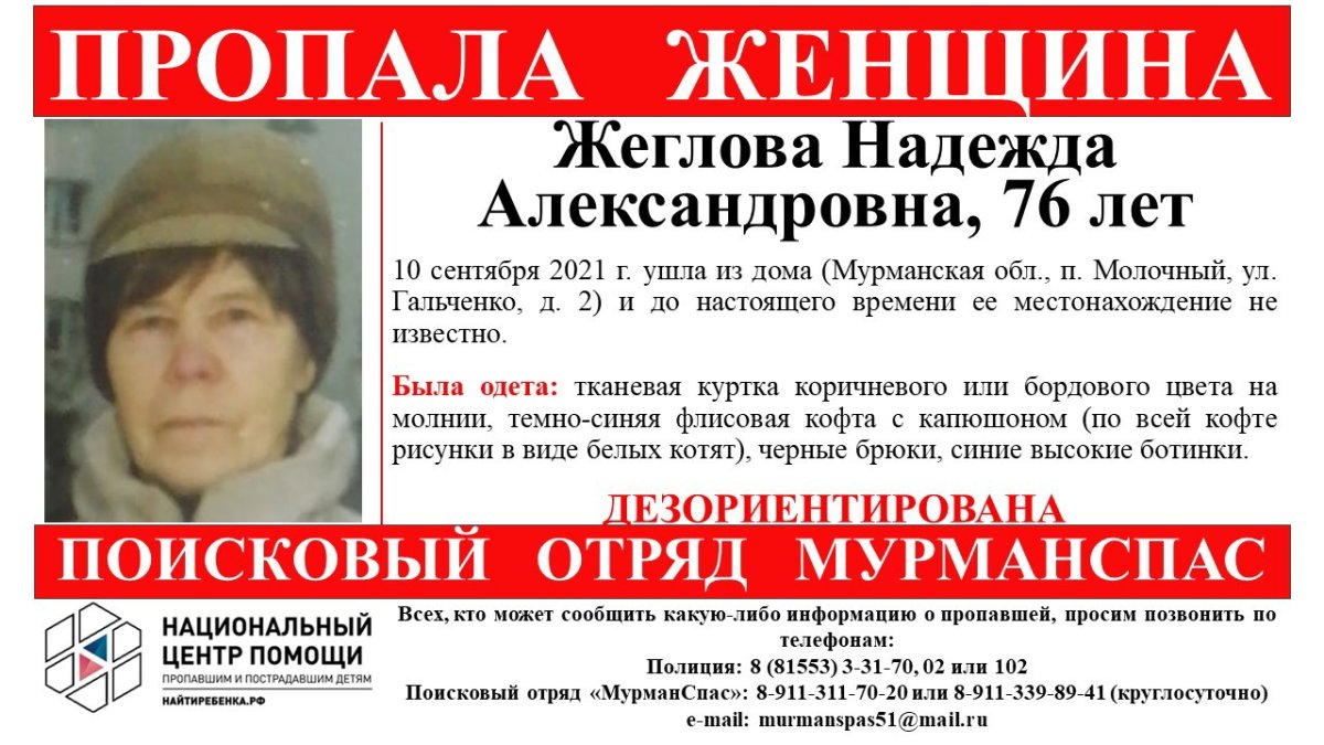 Всех, кто обладает информацией о местонахождении Надежды Жегловой, просят сообщить в поисковый отряд по телефонам 8-911-311-70-20, 8-911-339-89-41 или в полицию по номерам 8 (81553) 3-31-70, 02 или 102.