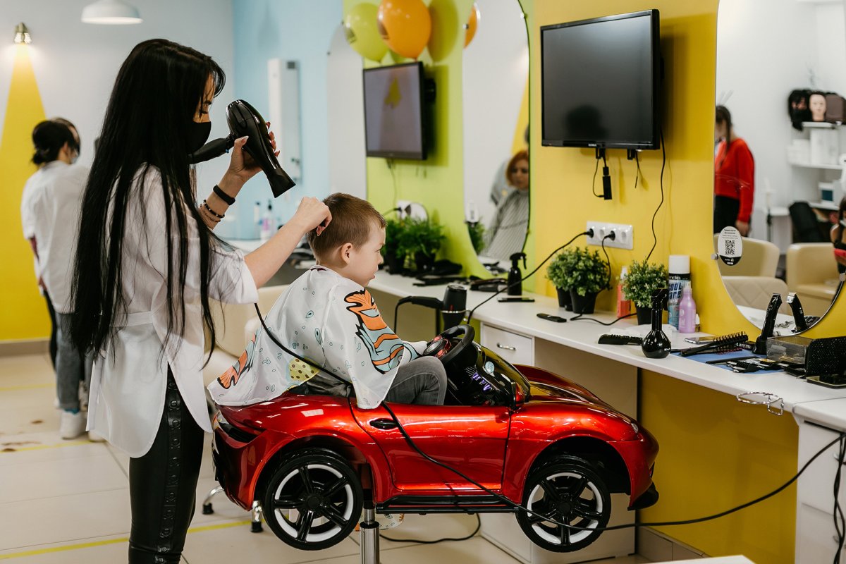 Для самых маленьких клиентов в салоне расположен обновленный «автопарк» - это современные кресла-машинки, в которых детям будет удобно, интересно и увлекательно во время стрижки. Также для малышей предусмотрены трансляция мультиков, игровая зона, мыльные пузыри, игрушки и шарики, чтобы пребывание в парикмахерской для них было игривым приключением без капризов.