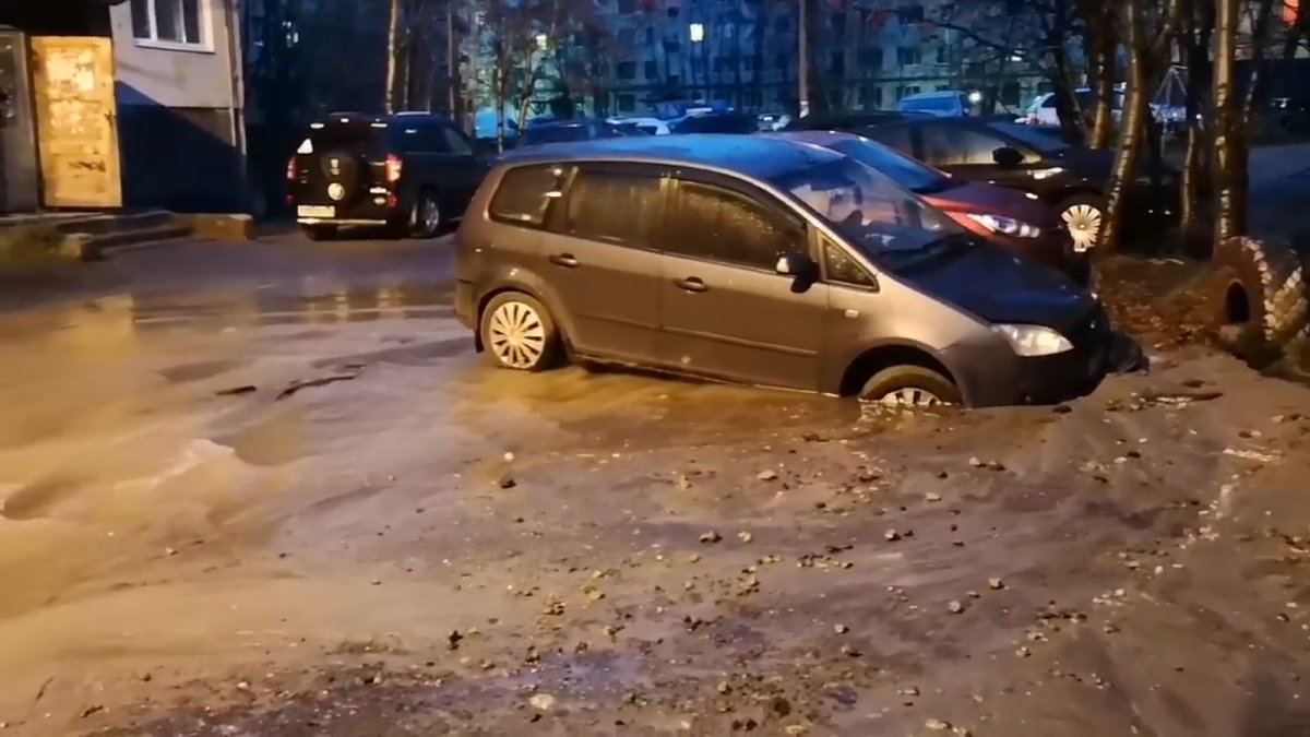 В результате прорыва холодная вода смыла часть асфальта. Припаркованный во дворе автомобиль Ford провалился в яму.
