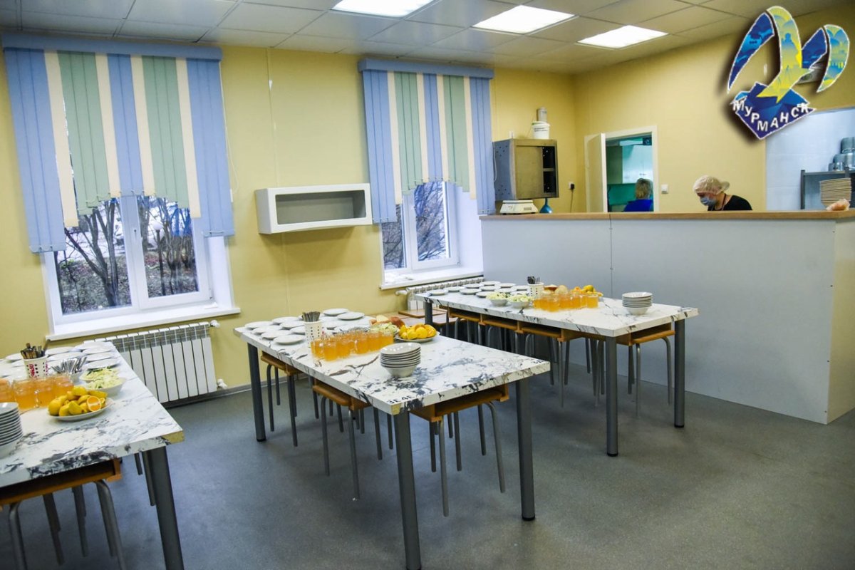 В Мурманске в прогимназии №40 на улице Буркова была отремонтирована столовая. В помещении установили новую мебель, оборудование, декоративные панели, потолок типа “Амстронг” со светодиодными светильниками и контроллер, где дети могут ставить оценки питанию. Также была заменена система отопления. Работы были осуществлены в рамках проекта “Arctic schools”.