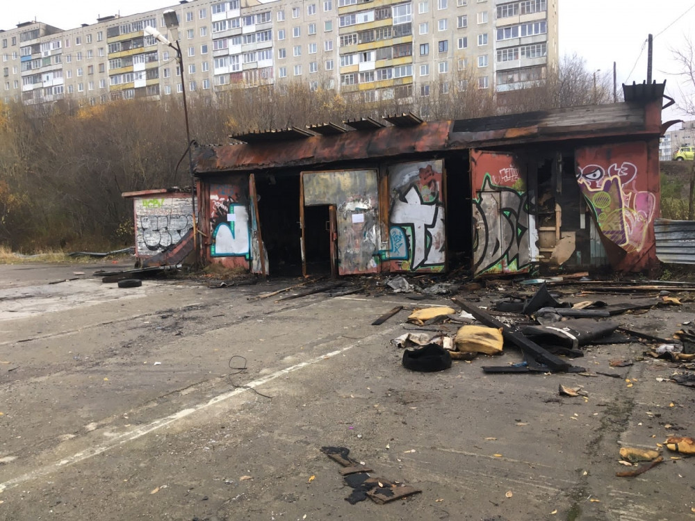 В Мурманске в сентябре в районе Щербакова, 34 сгорел деревометаллический гараж с пристройкой. С тех пор они так и стоят, никто ими не занимается.