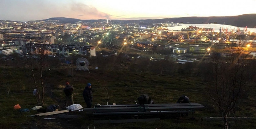 Рядом с мурманским арт-объектом “Солнце-барабан” установили деревянный амфитеатр с видом на Кольский залив, порты и город. Об этом сообщает ИА Nord-News.