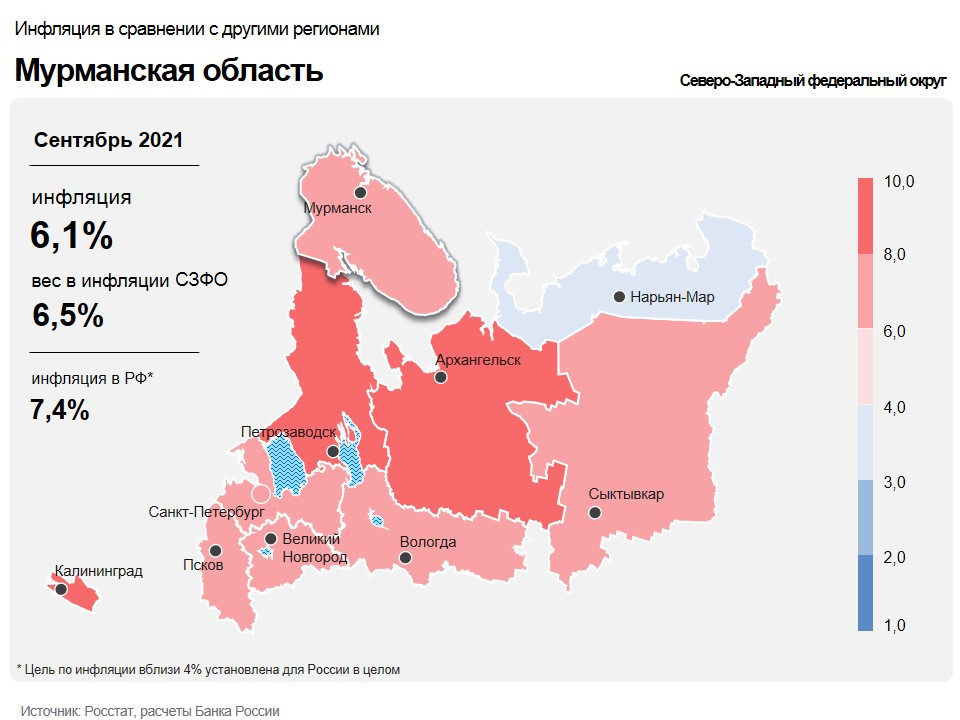 "При этом она [инфляция] по-прежнему оставалась ниже, чем в Северо-Западном федеральном округе (7,25%) и России в целом (7,40%)", - сообщили в региональном отделении Северо-Западного ГУ Центробанка.