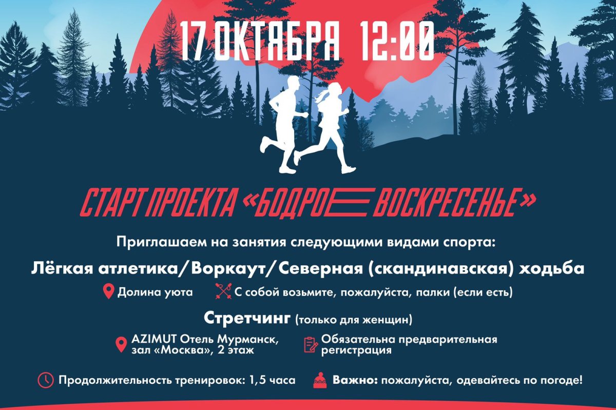 В воскресенье, 17 октября, в 12 часов дня в регионе стартует совместный проект министерства спорта и АНО "Спорт для всех 51" под названием "Бодрое воскресенье". В рамках нового проекта для жителей Мурманской области каждое воскресенье будут проводить бесплатные тренировки.
