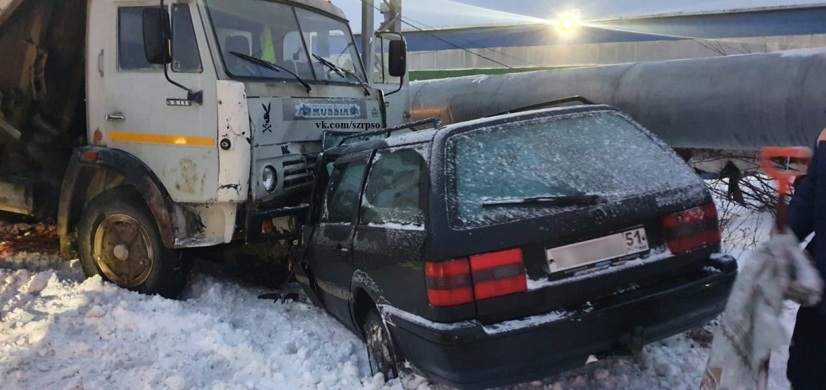 В Кировске на Апатитовом шоссе утром 29 октября произошла авария. На дороге столкнулись два автомобиля - легковой Volkswagen Passat и грузовой "КАМАЗ".