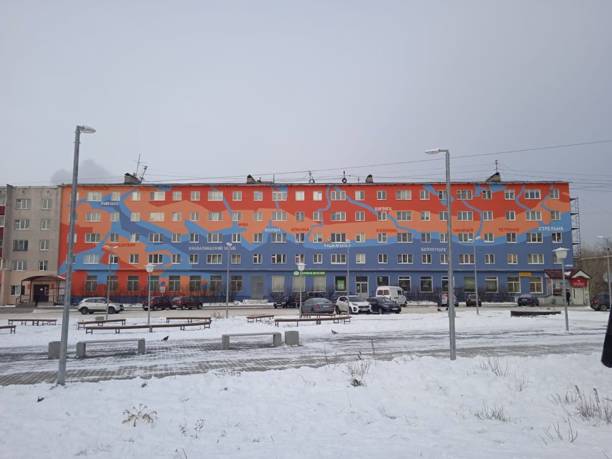В Кандалакше завершаются работы по художественному оформлению фасада дома на улице Первомайской. Подрядчик рисует на фасаде карту юга Мурманской области.