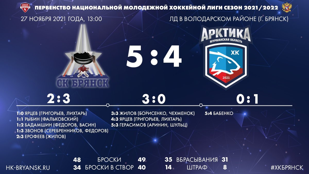 В Брянске завершился матч Первенства Националньой молодёжной хоккейной лиги между командами ХК "Брянск" и МХК "Арктика". В напряжённой борьбе хозяева одержали победу со счётом 5:4. По одной шайбе команды забросили, играя в неравных составах.