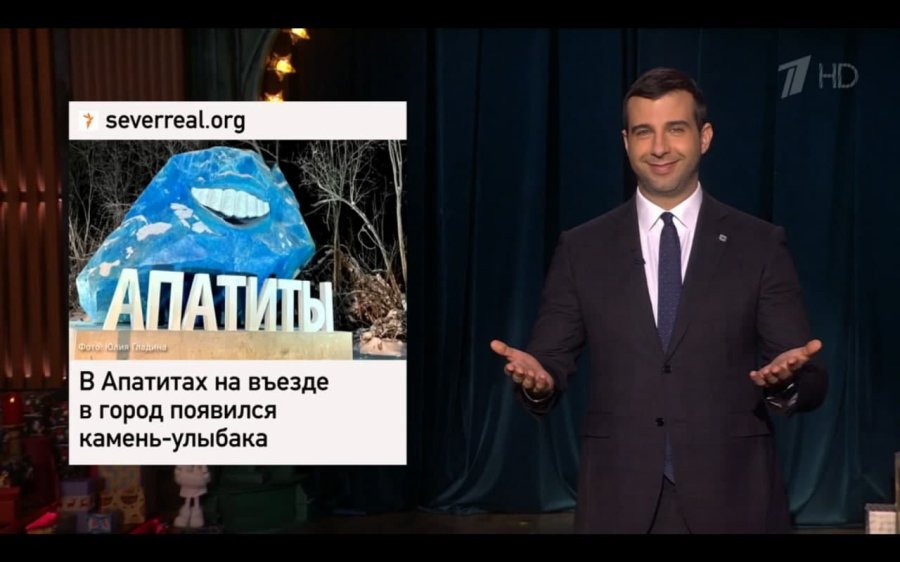 Арт-объект “Улыбающийся апатит” попал в шоу “Вечерний Ургант”. Большой минерал с зубами поставили на въезде в Апатиты в декабре.