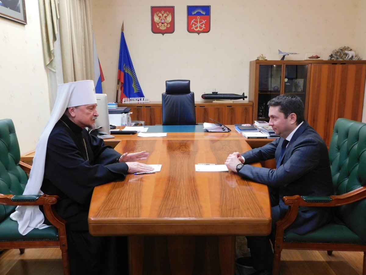 В среду, 29 декабря, в Мурманске состоялась встреча митрополита Мурманского и Мончегорского Митрофана и губернатора Андрея Чибиса. Они поприветствовали друг друга, подвели итоги уходящего года и обсудили вопросы рабочего взаимодействия.