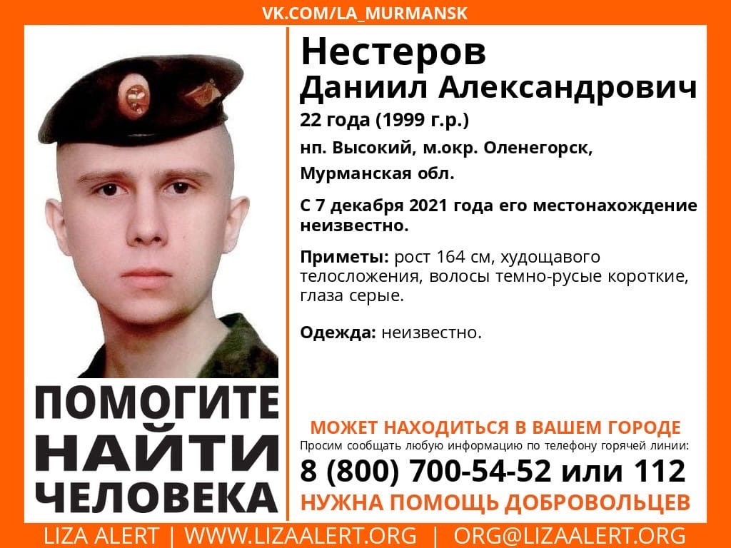 В Мурманской области разыскивается 22-летний Даниил Нестеров из населённого пункта Высокий (Оленегорск). Местонахождение молодого человека неизвестно с 7 декабря 2021 года. Об этом сообщает поисковый отряд "ЛизаАлерт" Мурманской области.