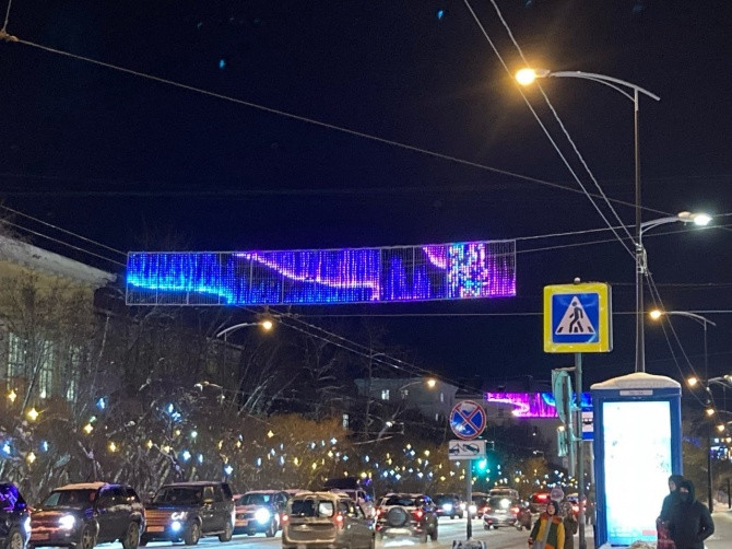 В центре Мурманска, у пересечения проспекта Ленина и улицы Капитана Егорова, во второй раз сломалась светодиодная растяжка. Впервые изображение северного сияния "дало сбой" на следующие сутки после запуска - 2 декабря. В январе сбой повторился.