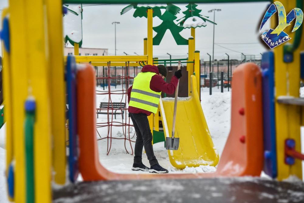 На фото: дворники убирают детскую площадку, лыжники тренируются на территории “Авангарда”