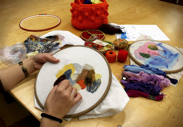 На фото: девушка занимается вышиванием