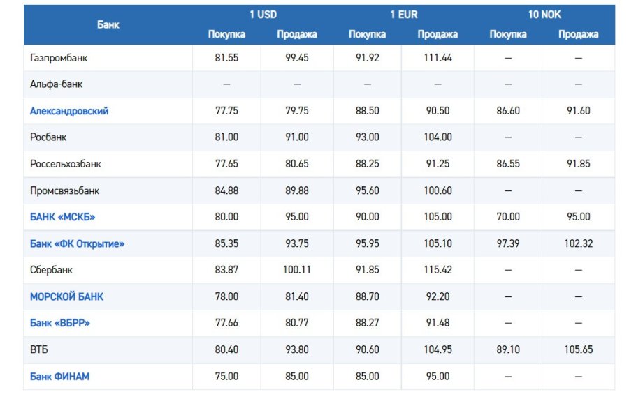 Так, доллар в мурманских банках продают дороже 100 рублей, а курс евро уже превысил 115 рублей. Норвежская крона продаётся дороже 105 рублей за 10 единиц. Подробнее о курсах валют в банках можно узнать на нашем сайте.