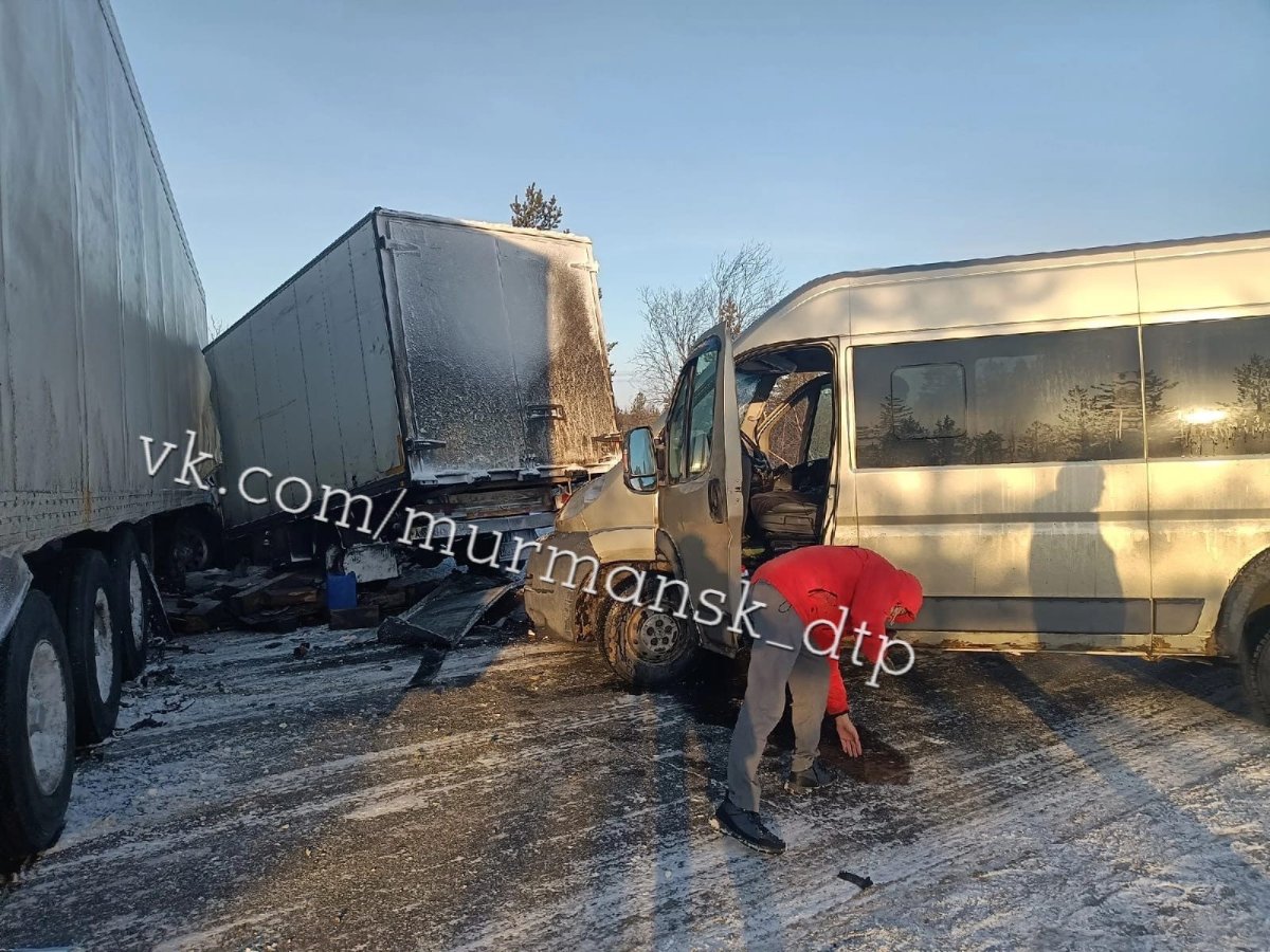 Ранее очевидцы рассказали в соцсетях, что примерно в 80 километрах от Мурманска занесло фуру, в связи с чем на дороге столкнулось четыре транспортных средства. Уточнялось, что в результате аварии у одной пассажирки сломан нос.