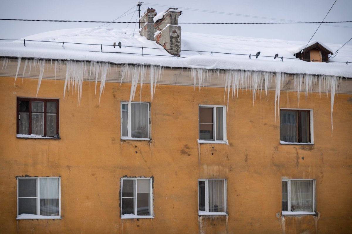 На фото: неочищенная кровля "сталинки" на Привокзальной улице в Мурманске