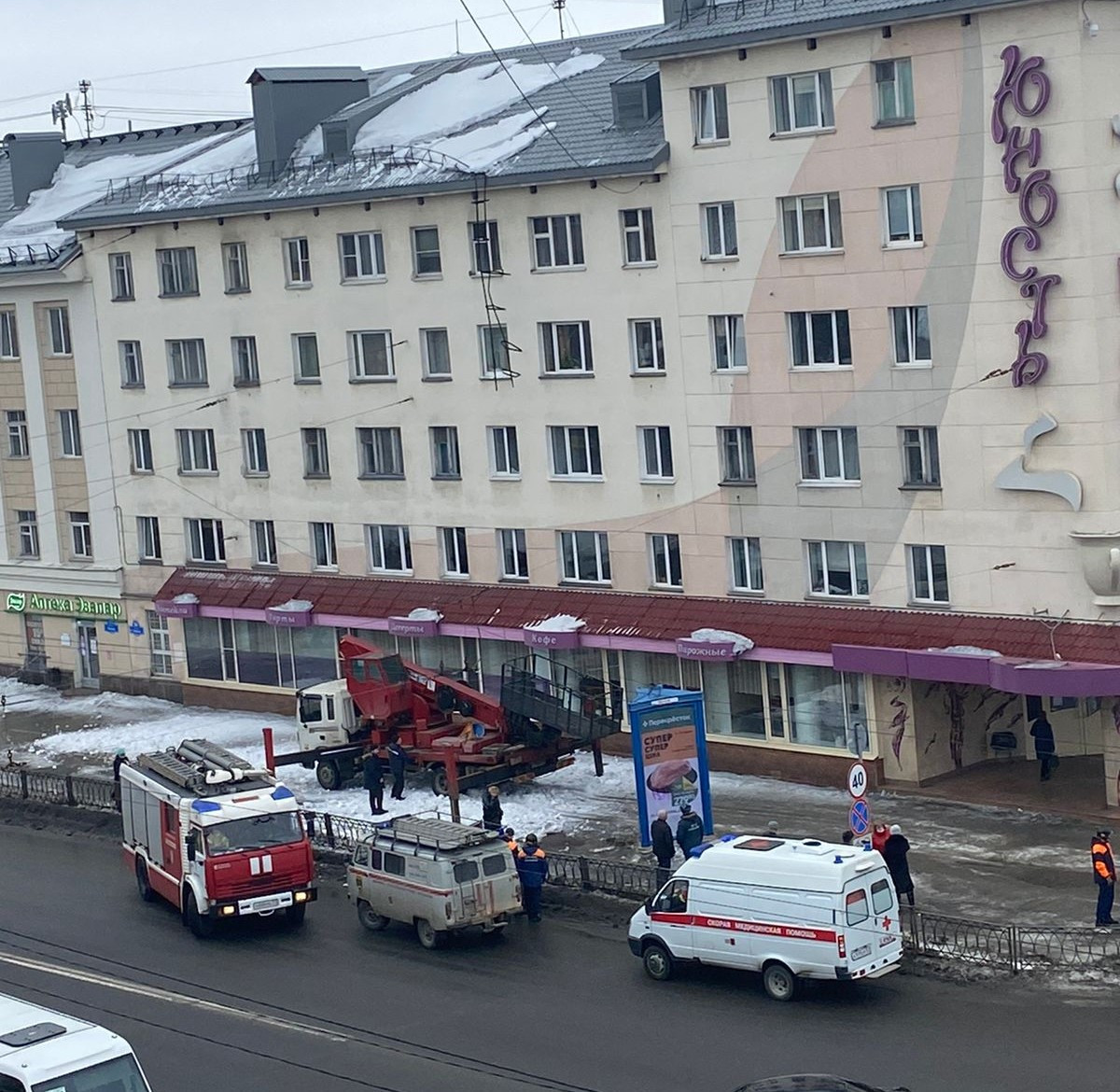 По сообщению очевидцев, с крыши чуть не упал человек. На месте работают сотрудники скорой помощи, приехали аварийно-спасательная служба и машина МЧС, автолестница.