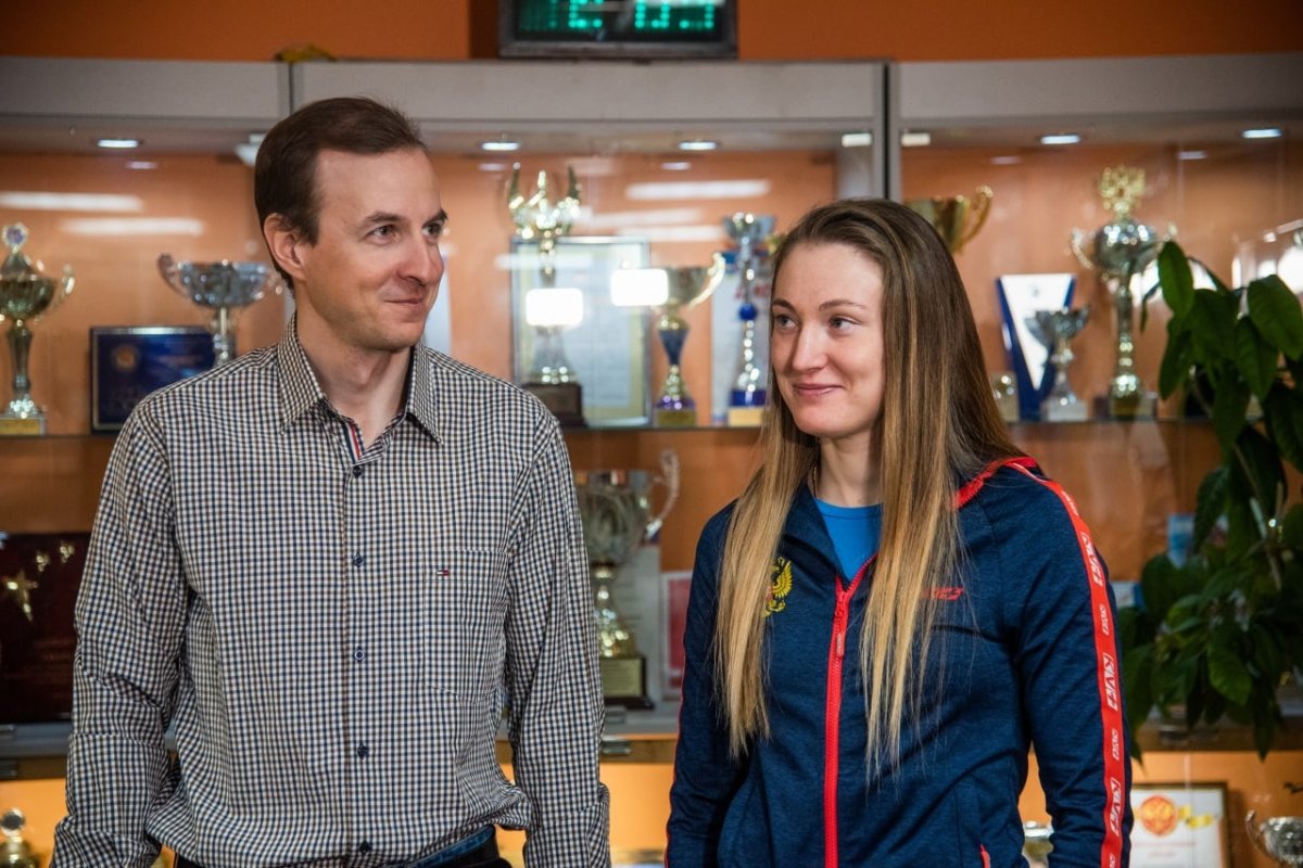На фото: биатлонистка Анастасия Егорова и тренер Александр Качановский в спортшколе № 3; Анастасия Егорова жмет руку заместителю председателя Совдепа Андрею Сысоеву