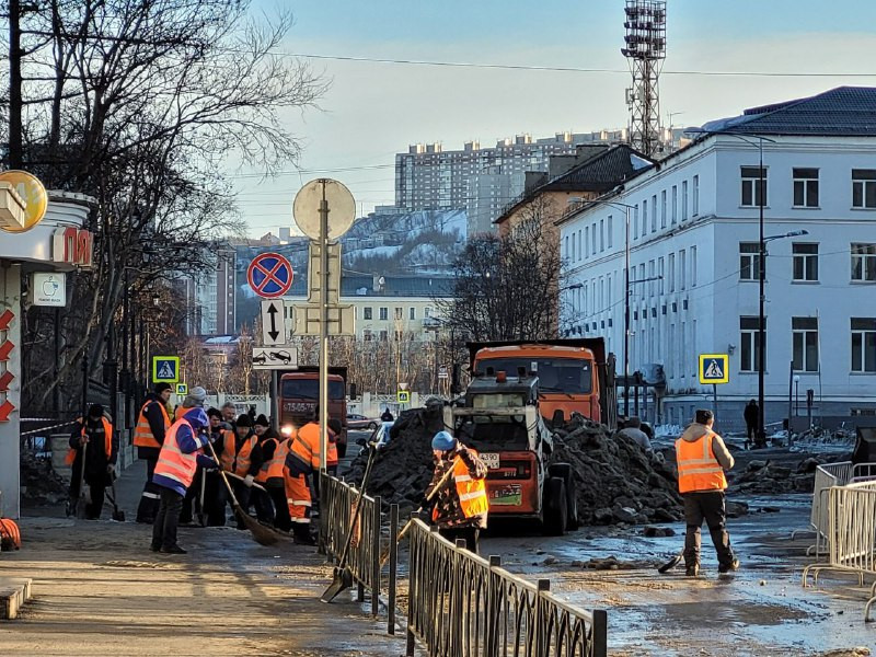 На фото: Коммунальные службы очищают дороги Мурманска от грязи и снега