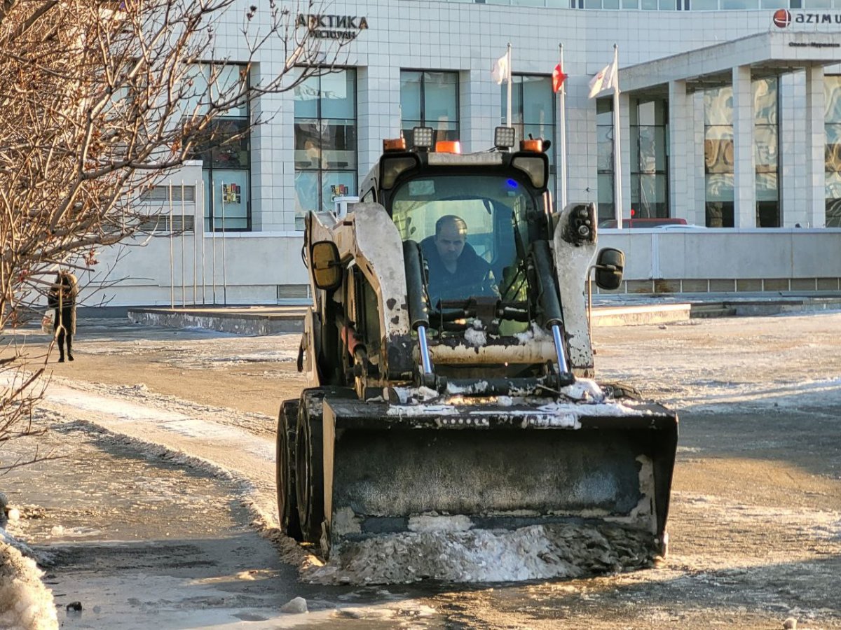 На фото: производится уборка территории перед ГДЦ “Арктика”