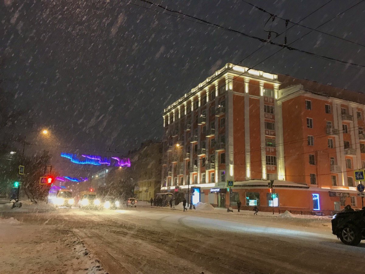 На фото: движение машин в снегопад на улице Егорова в Мурманске