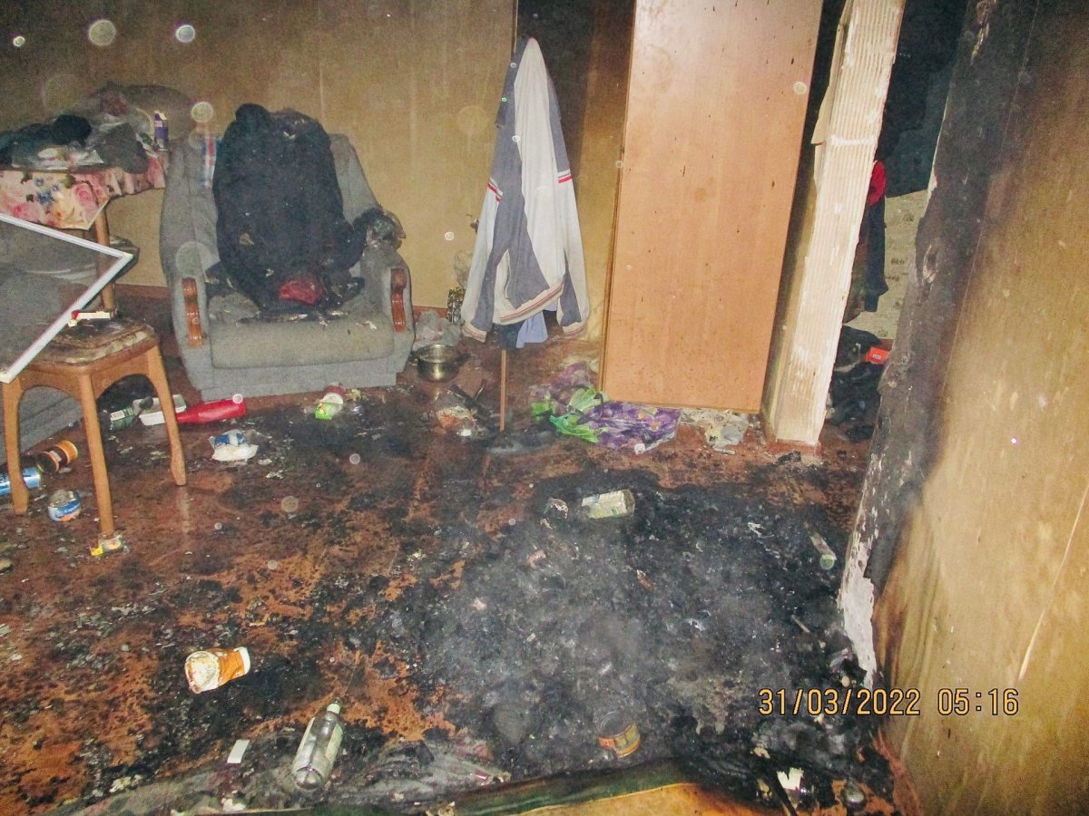 В результате пожара квартира закопчена полностью, обгорели вещи домашнего обихода