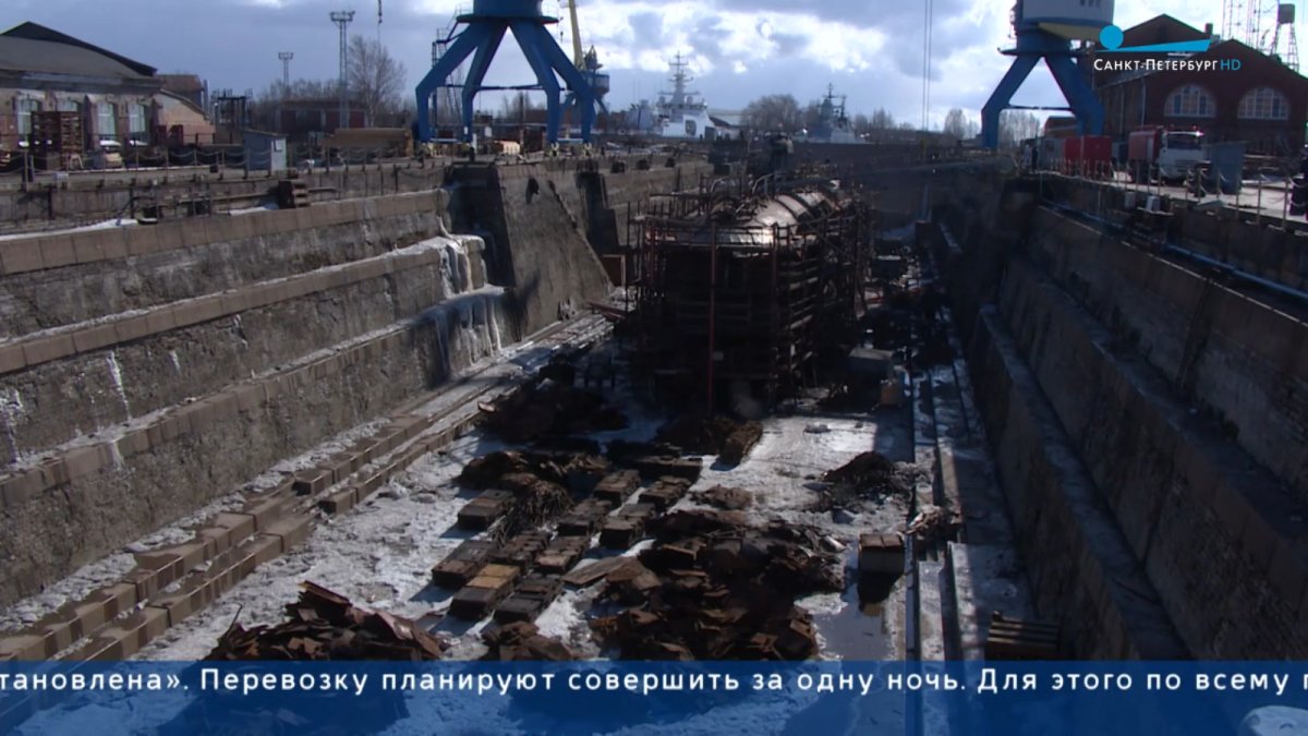 Сейчас специалисты завода демонтируют дефектные части легкого корпуса подводной лодки и готовятся к установке опорных элементов для будущей транспортировки. В начале июня "Ленинский комсомол" разделят на две части и отправят на полупогружной барже до морского терминала, где будет осуществлена закатка на специальные транспортные полуоси.